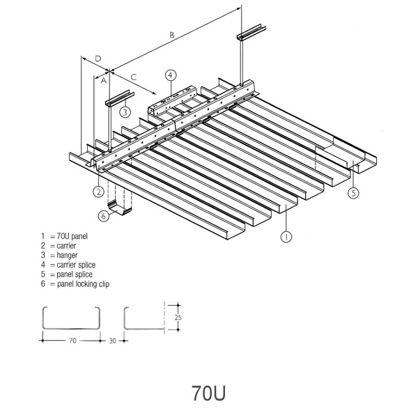 This system consists of box shaped panels which can be easily clipped on a carrier. Panels can be joined by using a panel splice. An open joint of 16mm is creatd between the panels.